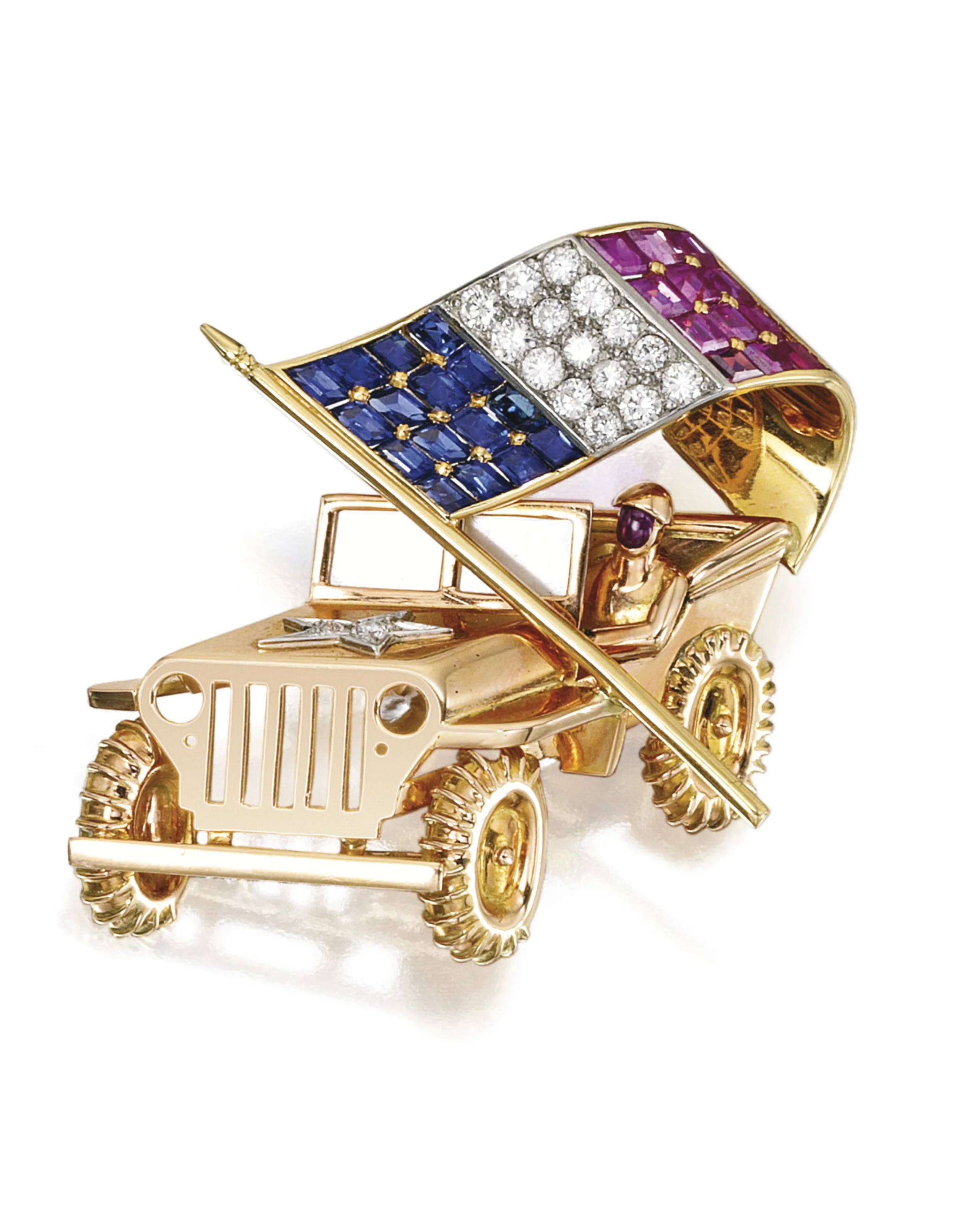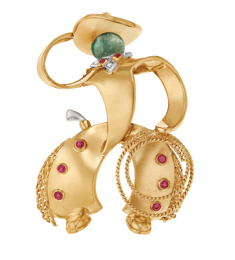 The big jewelry houses like Cartier, Van Cleef & Arpels, and Tiffany & Co. were still producing throughout the war, albeit in smaller numbers. Other design houses that did some great work in this era include Paul Flato, Verdura, Tony Duquette, and Traeber, Hoeffer, and Mauboussin. These ateliers defined the times with their unique take on jewelry staples turning the expected into the surreal. In spite of or, perhaps because of, the fear and chaos that gripped the world in the 1940s, the Retro jewels nod instead to a whimsical optimism. A much needed dose of hope and humor in an uncertain age.