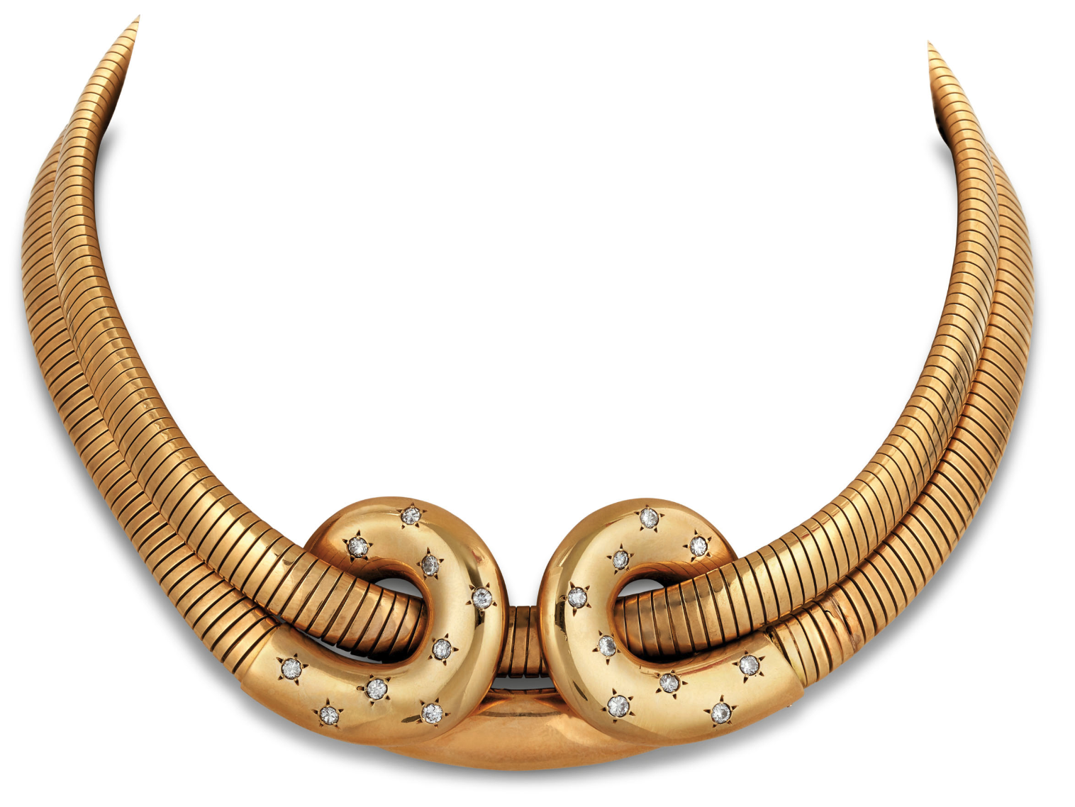 Jewelry was not the only thing changing with the times, women were changing too. Many went to work for the war effort and their floaty feminine fashions of the 1930s evolved into tight, shorter skirts and jackets with sensible, military-inspired silhouettes. Many jewels became a cheeky wink at more masculine aesthetics. Lines of cars and rows of munitions would transform into a link bracelet, a gas pipe would be translated into a necklace, a patriotic parade would turn into a brooch. It is this playfulness and resourcefulness that exemplifies Retro jewels, a welcome placebo for the horrors of war.