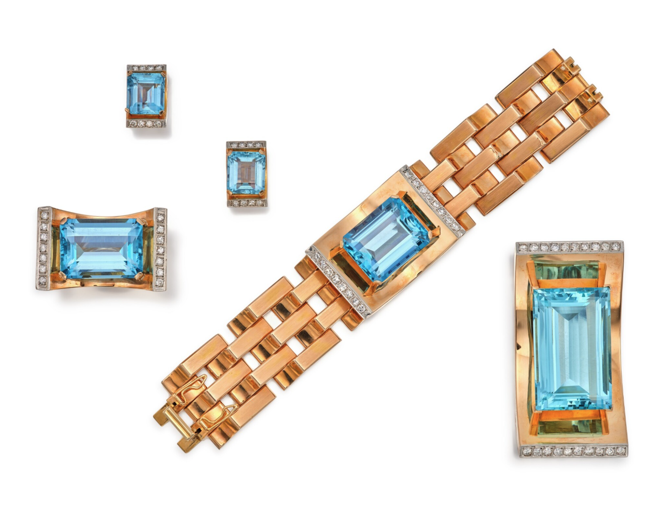 The change and upheaval of the 1940s affected all aspects of life. Production hubs were bombed out, platinum and precious metals regulated for the war effort couldn’t be sold, and craftsman were conscripted into service. If the jewelry of the 1930s was typified by platinum settings all-over set by diamonds and precious stones, than the 1940s would be defined by resourcefulness and the negative space of yellow gold. Large semi-precious stones—like citrine, topaz, aquamarine, and amethyst— could give a massive look for a fraction of the cost of their ruby, diamond, and sapphire counterparts. New alloys which included copper and used less gold gave the jewels a distinctive red tint. The jewelry that was produced included less precious stones and were lighter and less ornate than the pieces that were produced before 1940.